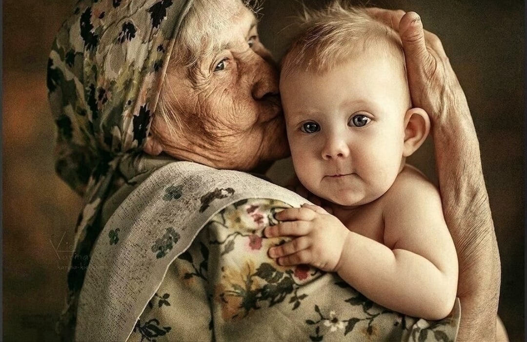 Трогательные моменты: бабушка и малыш на белом фоне